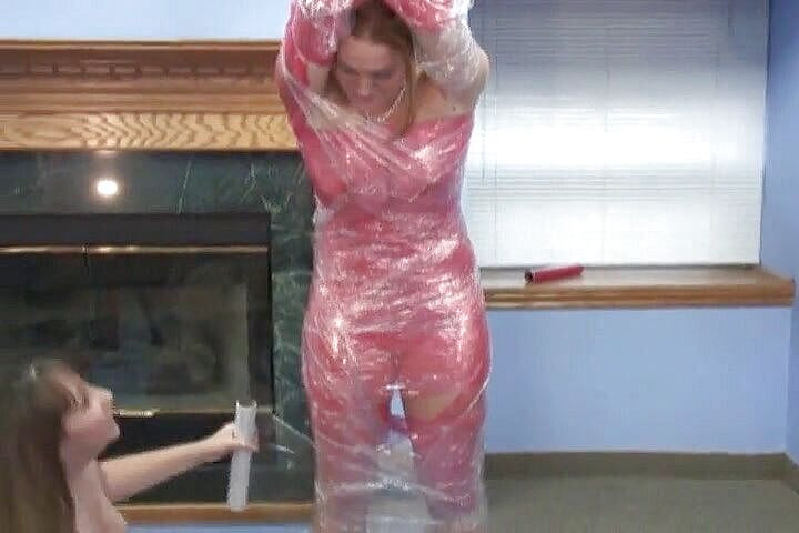 Blonde lesbo pussy dildoed while hanging from the ceiling in tape bondage.