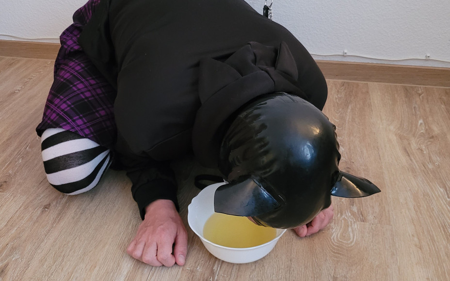 Mistress squats and fills a bowl with her hot piss. The pathetic sissy watches her pee, while being chained up like a slave and is ordered to lap it all up. On her knees, tongue out, swallowing every drop.