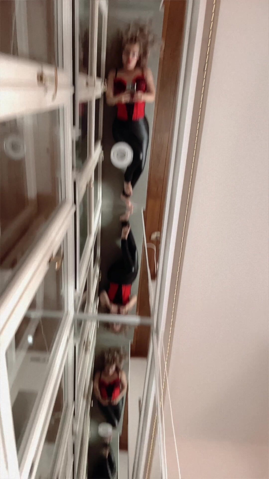 In front of the mirror. Dancing in front of the mirror. I dance in front of the mirror. I film myself on my phone. I look very closely at the phone due to poor eyesight. I see my reflection in the mirror. My legs are reflected in tight-fitting leather leggings. My feet are reflected. My toenails are bright red. The color of my red nails is red. The color of my full, juicy lips is also red. The tint is red with a sultry lace pattern. I look very sexy and easily tempt you. My gaze is provocative.