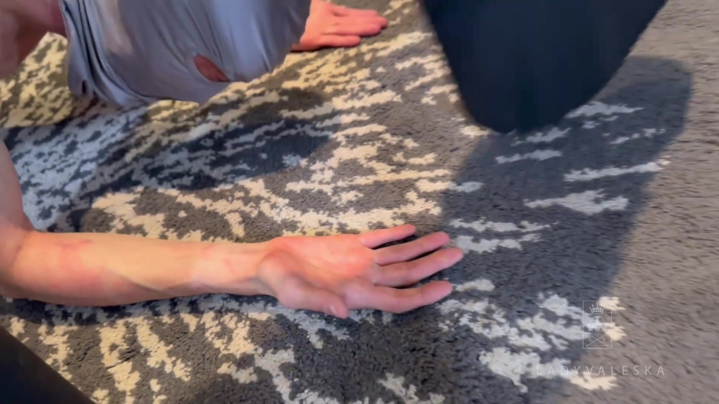 Mám velké, neohrabané boty na platformě. Tím lepší je, když se honí na tohoto otroka. Okamžitě se povšimnu, když šlapám a váhou plnou váhou na svého otroka. Miluje dívat se na boty, ale díky hmotnosti na stomp opravdu cítí tu křupku.