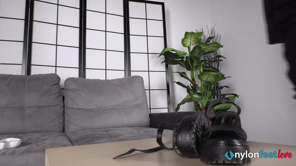 Everyone needs a break from time to time and different people choose different things to do in order to relax. For Violet, it is really simple. She must have some time for herself and her feet. She loves her cigarettes as well and she lights one up at the beginning of this relaxing session. She is all in black today and her sexy feet are in black nylons and in black high-heel boots. But these boots don't stay for too long on her feet. She dangles them off and shows us her happy toes and sexy soles. You will enjoy watching her twisting and spreading her toes while her feet are inches away from your face.