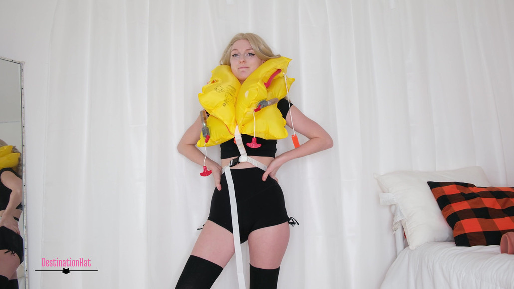 You ask me to put on a life jacket for you. I'm nervous and weirded out, but I do it anyways. You then ask me to pull the cords instead of blowing it up by air. I'm super nervous but do it anyways. After this, I talk about how annoying it is and weird, and to help me out of it.
